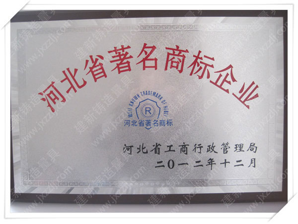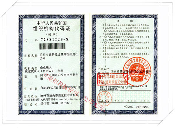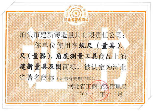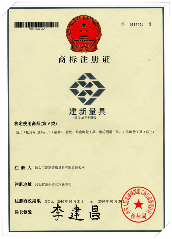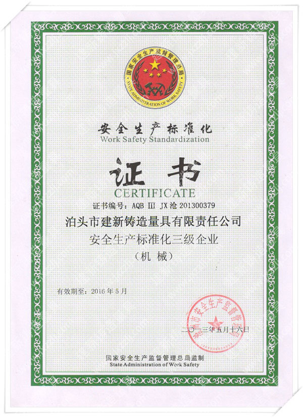 泊頭市建新鑄造量具有限責(zé)任公司是河北省固定資產(chǎn)重點投資項目技術(shù)企業(yè)。取得“建新量具-商標(biāo)注冊證”“河北省名牌產(chǎn)品”、“河北省著名商標(biāo)”、中國鑄造協(xié)會常任理事單位“機(jī)械工業(yè)質(zhì)量管理獎”、“滄州市第九屆消費(fèi)者信得過單位”、“中國人民銀行機(jī)構(gòu)信用代碼證”“、計量器具新產(chǎn)品樣機(jī)試驗合格證書“全國安全生產(chǎn)三級認(rèn)證企業(yè)”等榮譽(yù)稱號。